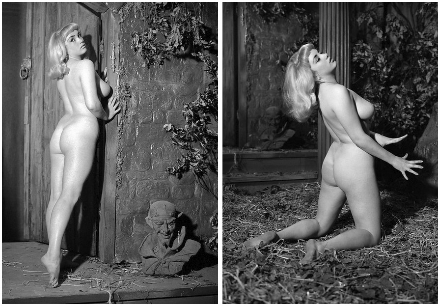 The shapely form of Cleo Simmons by Harrison Marks. Posing in the doorway of the coven set Cleo looks perfectly posed on tiptoes and kneeling showing off her ample curves. The Devil’s Head pops up again in these shots, but works well against the stone wall and step.