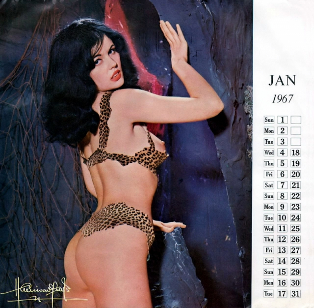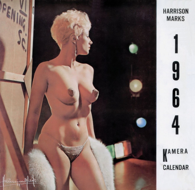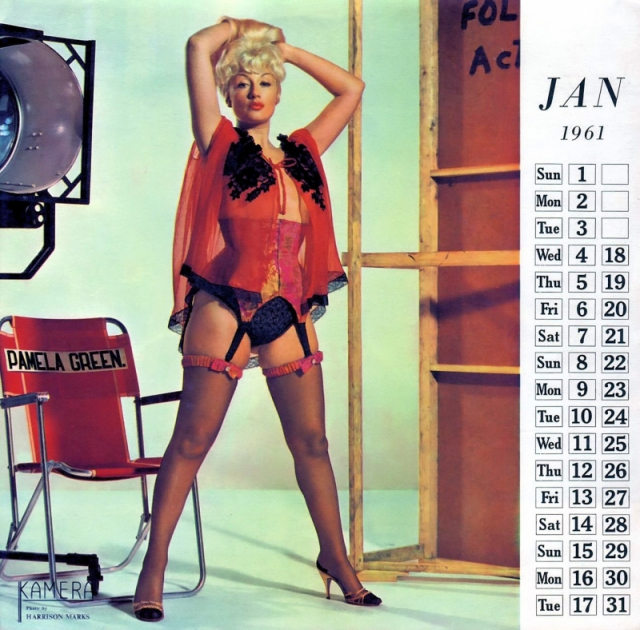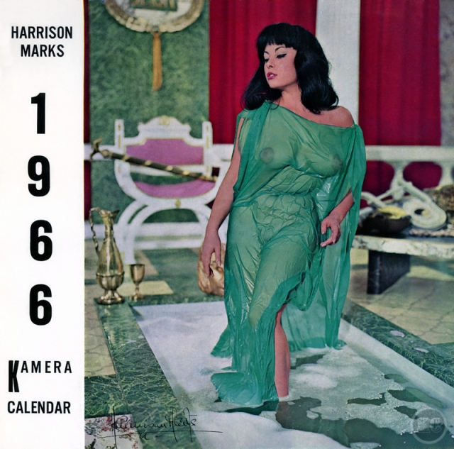 The first Harrison Marks glamour calendar seems to date back to 1955, and featured a photograph of Pamela Green. In October 1957 Kamera Publications advertised a colour calendar, which went into production in 1958 and consisted of a single photograph of Pamela Green, 2 ft. by 6 in. printed in full colour on high quality art paper with a tear-off calendar block. A series of similar calendars were produced each year well into the sixties and were often printed with a company name and were very popular with the motor and engineering trade.