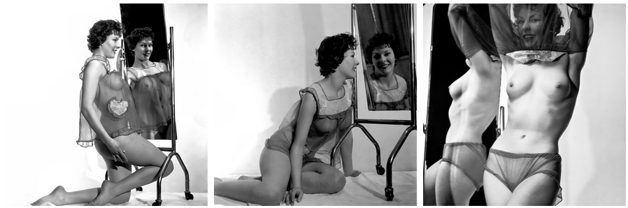 Three cheeky shots of June Russell posing and stripping out of a see through baby doll nighty, using her reflection in the mirror for added effect. I love the sheer nighty in all shots and panties in the bottom shot that’s allowing us to see just a glimpse of June beneath the panties, perfect!