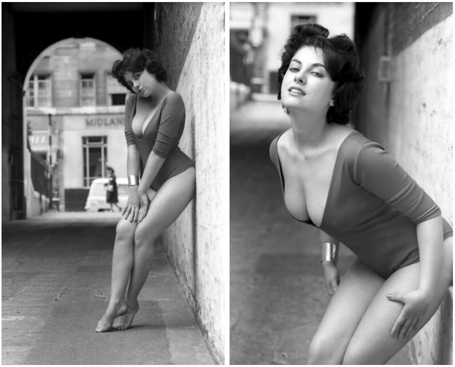 I love the pose from June in the leotard as she leans against the alley wall, with a buxom bosom showing, but I’m also sadly intrigued by the location and where this was taken. I wonder if it was taken near Strobe studio’s in Clapham and as you look back up through the alley you see a woman walking past what I think is a sign for Midland Bank?