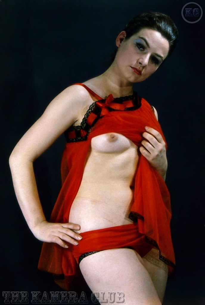 Three shots of a cheeky little flash from Val Van Dotson from restored 35 mm colour slides. I love the little red outfit, from the red panties to the little red négligée she is lifting to give us a flash of that slender figure! Not the most well-endowed model, but a nice little perky pair all the same. :)